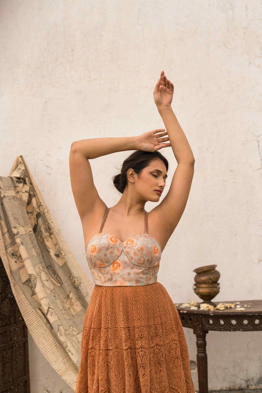 Regular price Rs. 58,500.00Regular priceUnit price / perSale price Rs. 58,500.00Detachable chintz & kashida dress with embroidered straps and belt